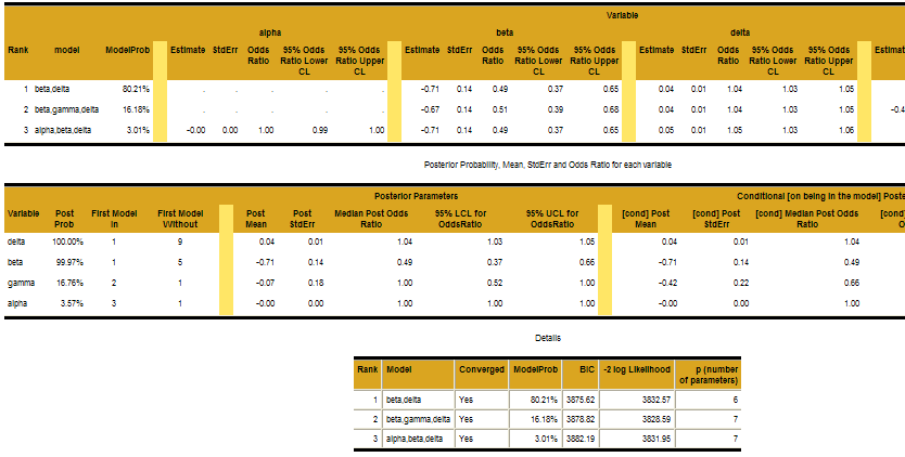 %BICOrdinalLogistic(outModels=bicModels, outParms=bicParms, data=myData, outcome=Y, indep=alpha beta gamma delta);