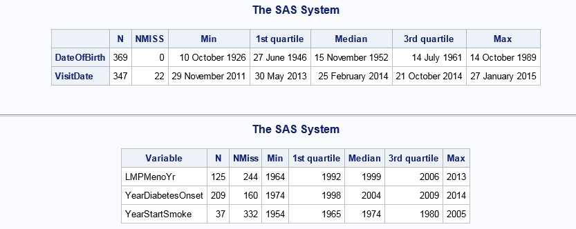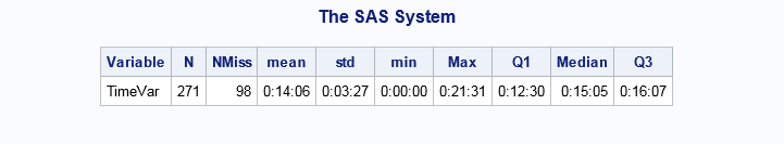 %TimeDesc(data, TimeVars, stats=N NMiss mean std min Max Q1 Median Q3, nfmt=4.0, fmt=time8., qfmt=time8.); %YearsDesc(data, YearVars, nfmt=4.0);