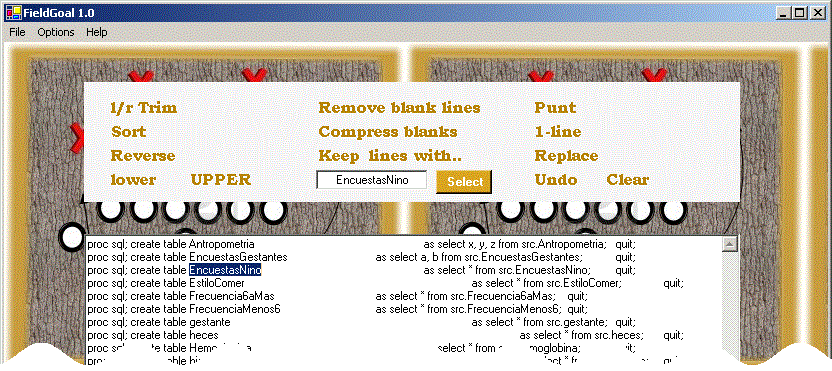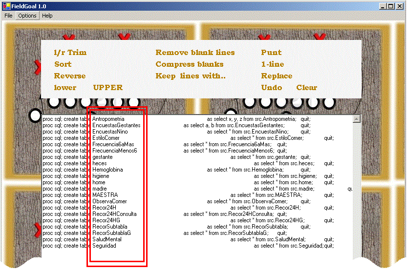 FieldGoal is a program for quickly extracting text in a column from a text file. In addition, the values extracted can be aligned to a single line of text by just one more click. In the example illustrated below, we pasted some programming code from which we want to extract the column surrounded by a double-sided orange rectangle.