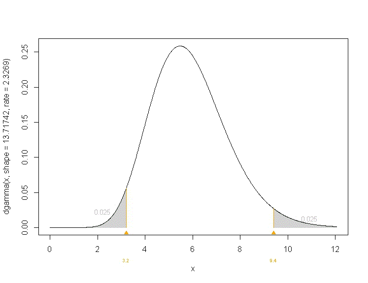 The code below reproduces the input and output of an R session involving a call to gamma.parms.from.quantiles. The use of option plot=T produces the plot attached below (default is to not produce the plot). The output shows that a Gamma distribution with shape parameter shape=13.72 and rate=2.33 lies in range (3.2, 9.4) with probability 95%, with equal probability tails.