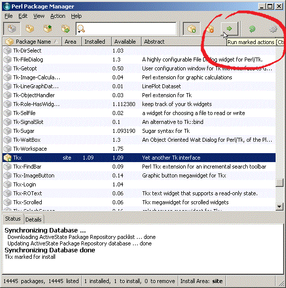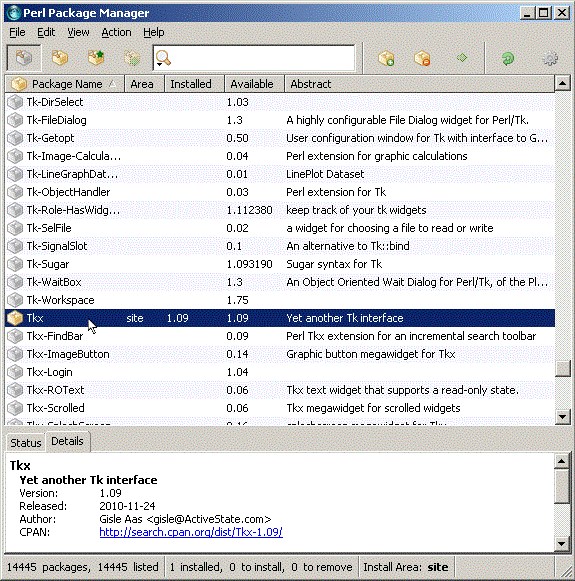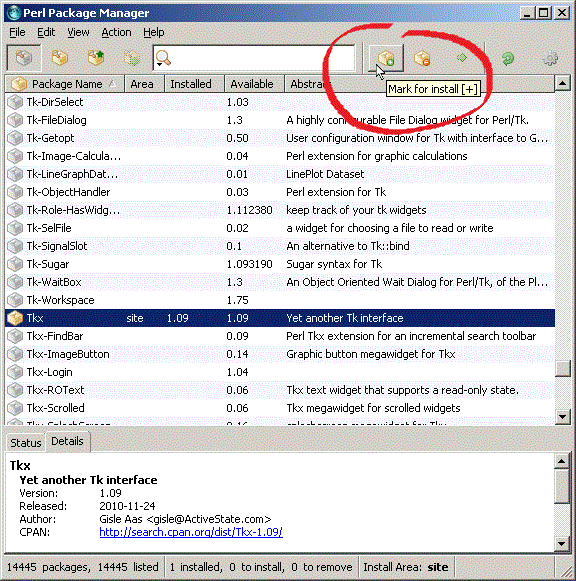 If the PPM GUI works on your system, it is also easy to install a module (or a bunch of modules) with a few clicks. To install Tkx Perl module (necessary for WinBUGSLogs2HtmlSummary), scroll down the Package Name list and select Tkx by clicking its name.